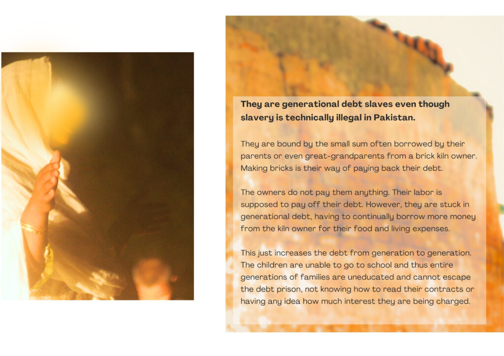 The children are unable to go to school and thus entire generations of families are uneducated and cannot escape the debt prison, not knowing how to read their contracts or having any idea how much interest they are being charged.